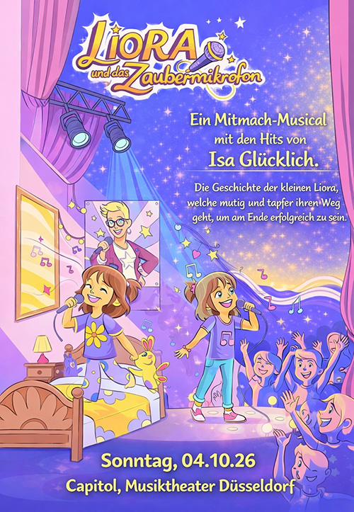 Wenn Kinderträume leuchten und Musik Herzen öffnet, beginnt etwas ganz Besonderes: Isa Glücklich feiert mit ihrem ersten eigenen Mitmach-Musical „Liora und das Zaubermikrofon“ große Premiere – am 4. Oktober 2026 im Capitol Theater Düsseldorf.